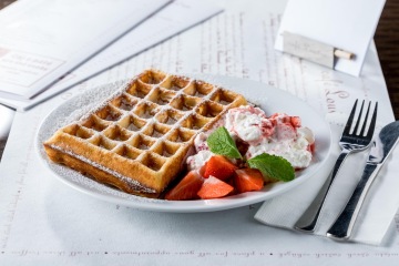 ČERSTVÁ VAFLE S JAHODOVÝM ŽAHOUREM a čerstvou jahodou