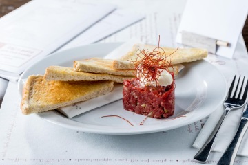 FINELY CHOPPED STEAK TARTARE SOFTENED WITH MASCaRPONE, chilli chips, garlic toasts
