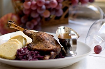 confit duck leg, red sauerkraut with apples, potato gnocchi with butter breadcrumbs
