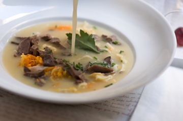 hearty st martin´s tripe soup with fresh marjoram, sourdough bread
